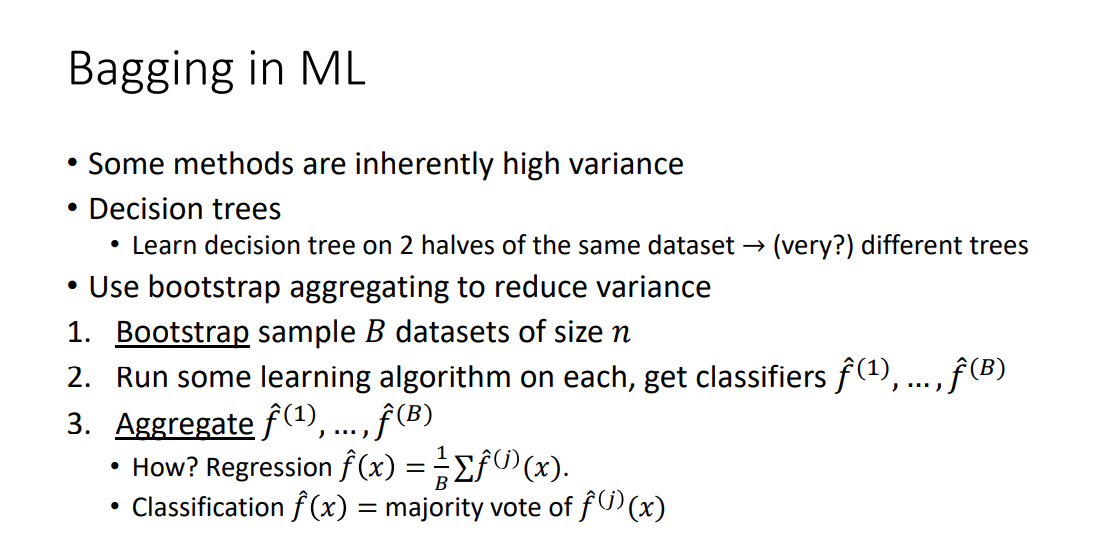 The idea is that averaging over independent datasets reduces variance by factor . But this needs times more data. So we cheat by reusing parts of the same dataset (sampling with replacement). That is what bootstrap sampling does!