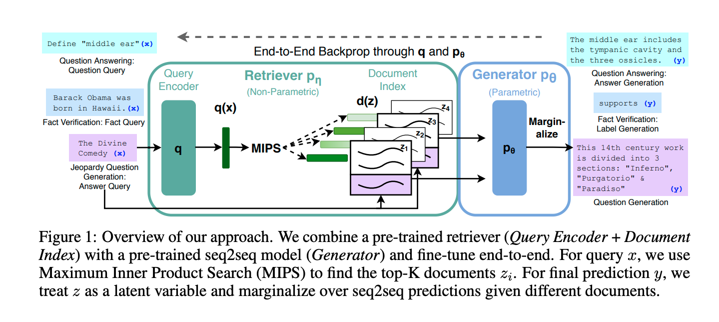 What is new in their approach, and why do they think it will be successful? It is composed of two parts: a retriever (implemented with a DPR) and a generator (implemented with BART). Because it is trained end to end, the retriever learns to fetch the most relevant documents, and the generator is conditioned on a retrieved document provided by the retriever, and learns to generate the correct output token by minimizing the cross-entropy loss.